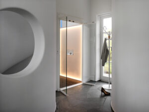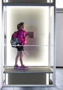 La cabine se compose de la plate-forme en forme de L et du DesignWall. Il s’agit de la partie mobile de l’élévateur qui monte et descend lorsque vous l’utilisez. L’élévateur est contrôlé au moyen d’un panneau de contrôle situé au centre du DesignWall. Il vous suffit de sélectionner l’étage souhaité et de démarrer l’élévateur en tournant et poussant l’unique SmartControl du panneau de contrôle.