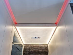 La cabine est fournie avec une paroi latérale de 2 000 mm de haut appel e DesignWall, un nom choisi pour décrire son design élégant et unique. Le DesignWall est livré par défaut avec une paroi de verre acrylique durcie résistante aux rayures et un fond blanc. Il est rétroéclairé par un éclairage à LED. Il est possible de rendre l’élévateur encore plus spectaculaire en personnalisant le DesignWall avec un de nos motifs ou une de nos images.
